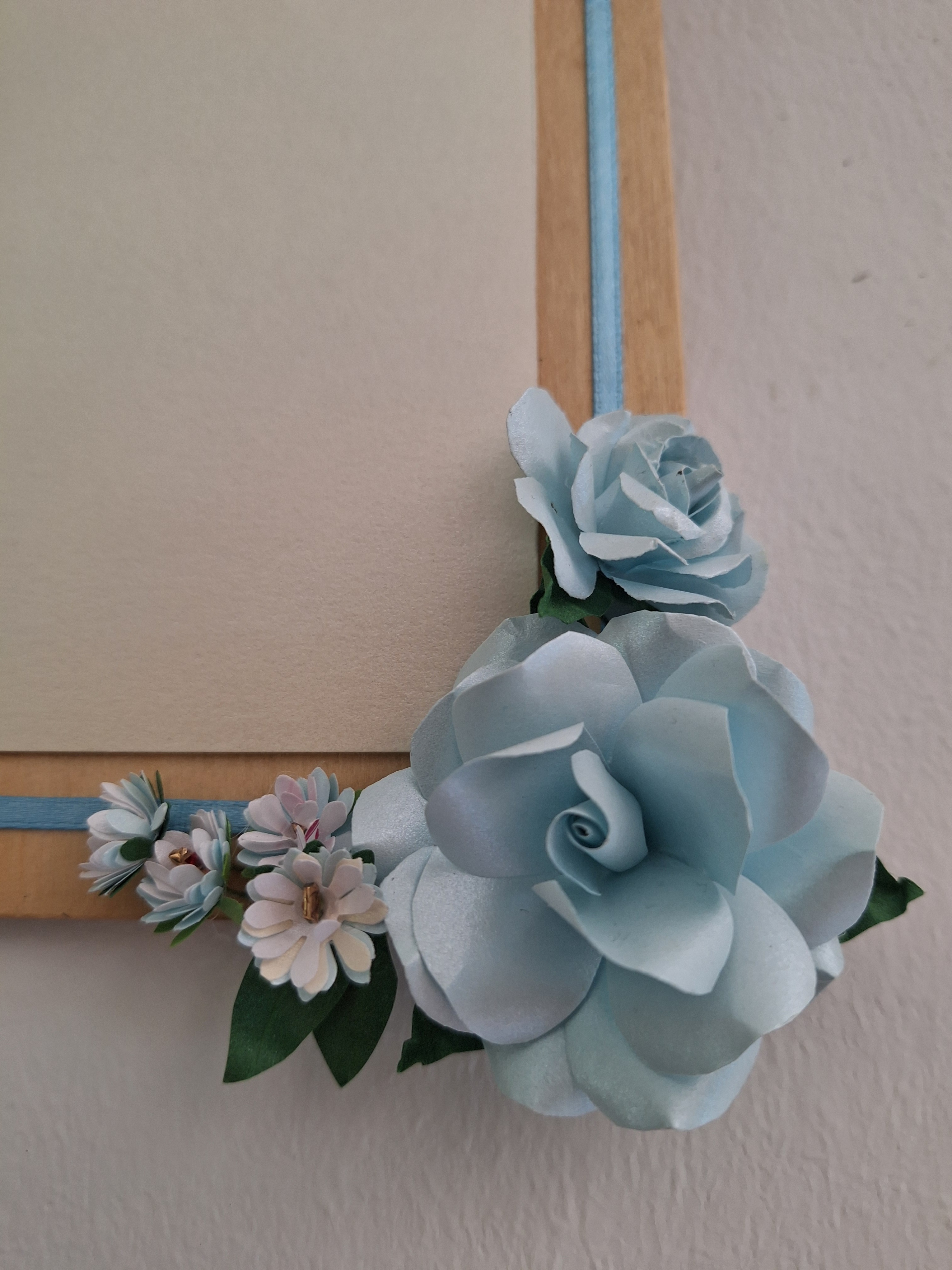 Papírvirágokkal díszített vékony fatábla, a baba születési adataival, gravírozott vagy nyomtatott decoupage felirattal, selyemszalag akasztóval. A képen szereplő tábla 14*14 centiméteres, felirat számára rendelkezésre álló hely 10*10 cm. Téglalap, ovális vagy kör formában is elkészíthető. A hagyományos színeken felül jól mutat vegyes pasztellszínekben is, de bármilyen színvilágban kérhető. Irányár: 10 000 Ft
