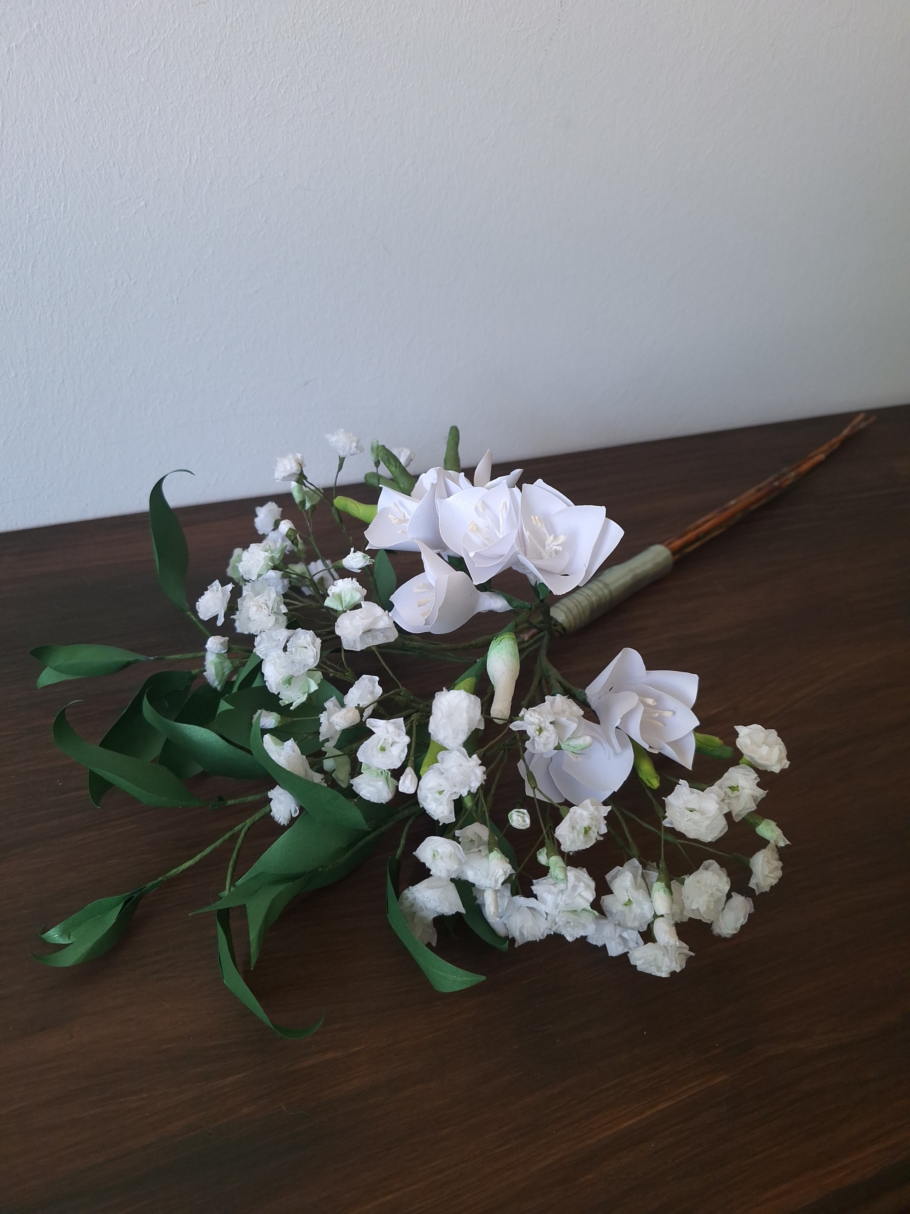 Fátyolvirágból, fréziából és ruszkusz ágból álló egyszerű fehér csokor
