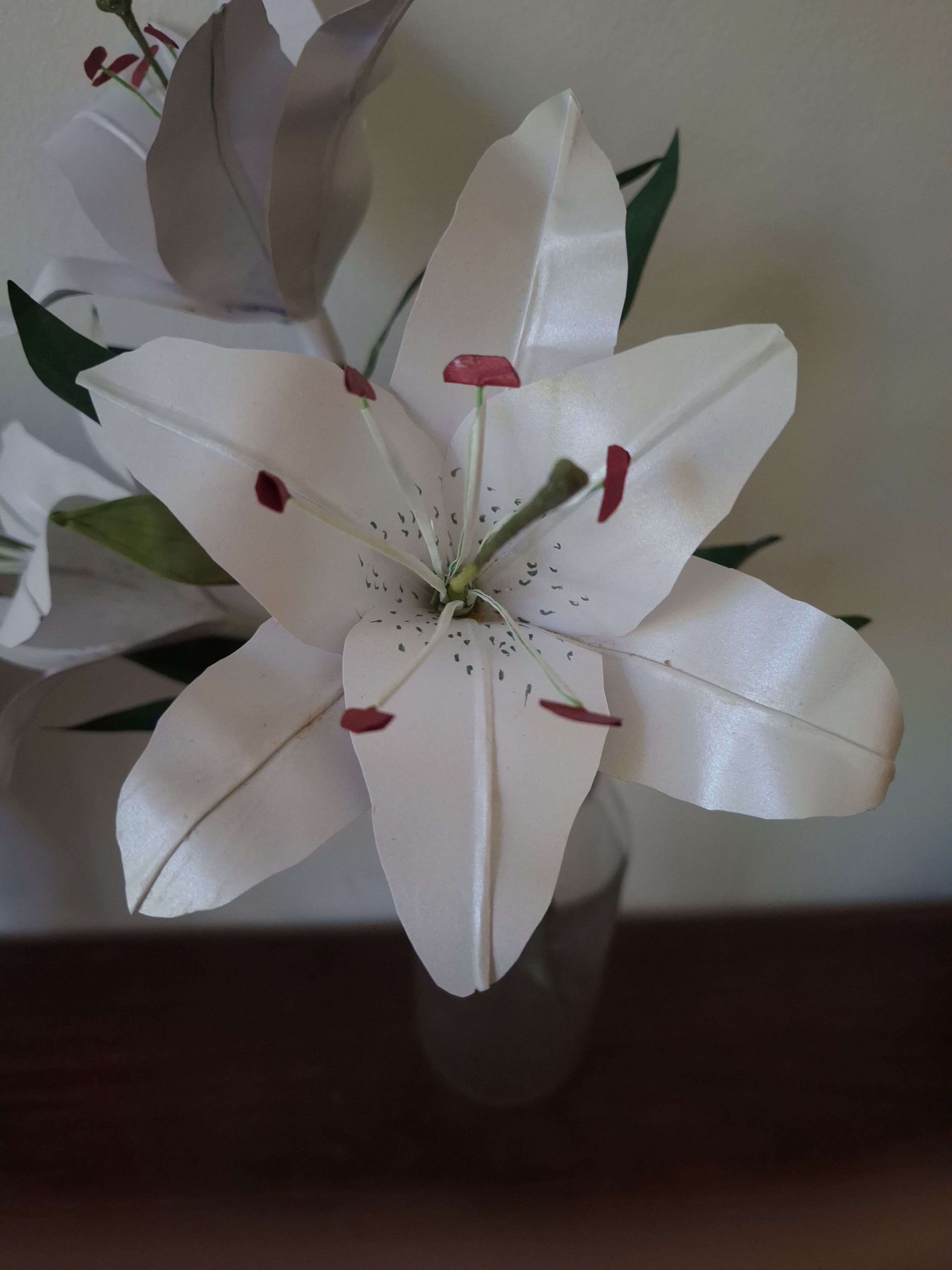 Élethű liliomszál selyemfényű papírból készült virágokkal, zöld bimbóval. Irányár: 8 000 Ft.