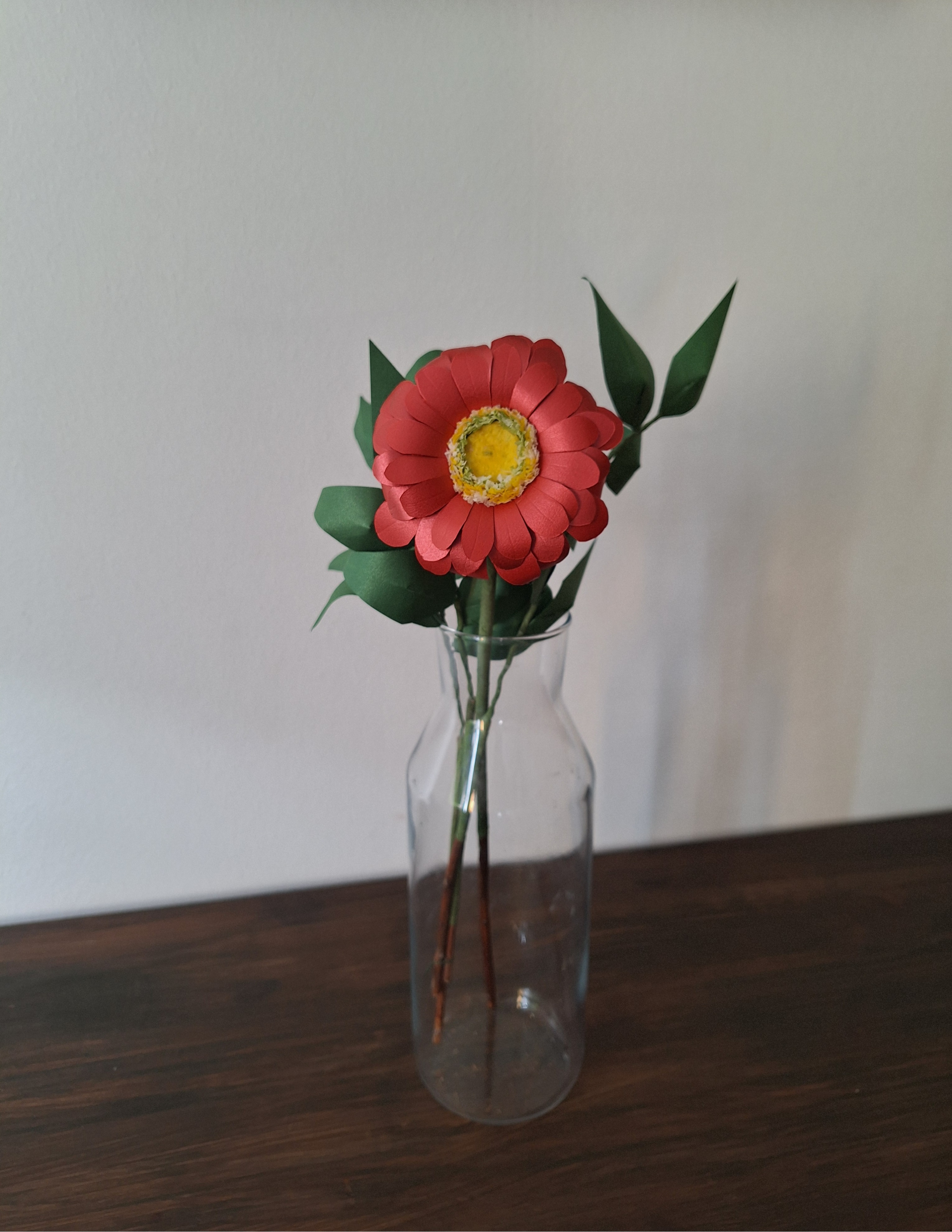 Metálfényű papírból készült gerbera, a közepe többszínű virágkötőszalagból van, természetes aranyvessző szárral.