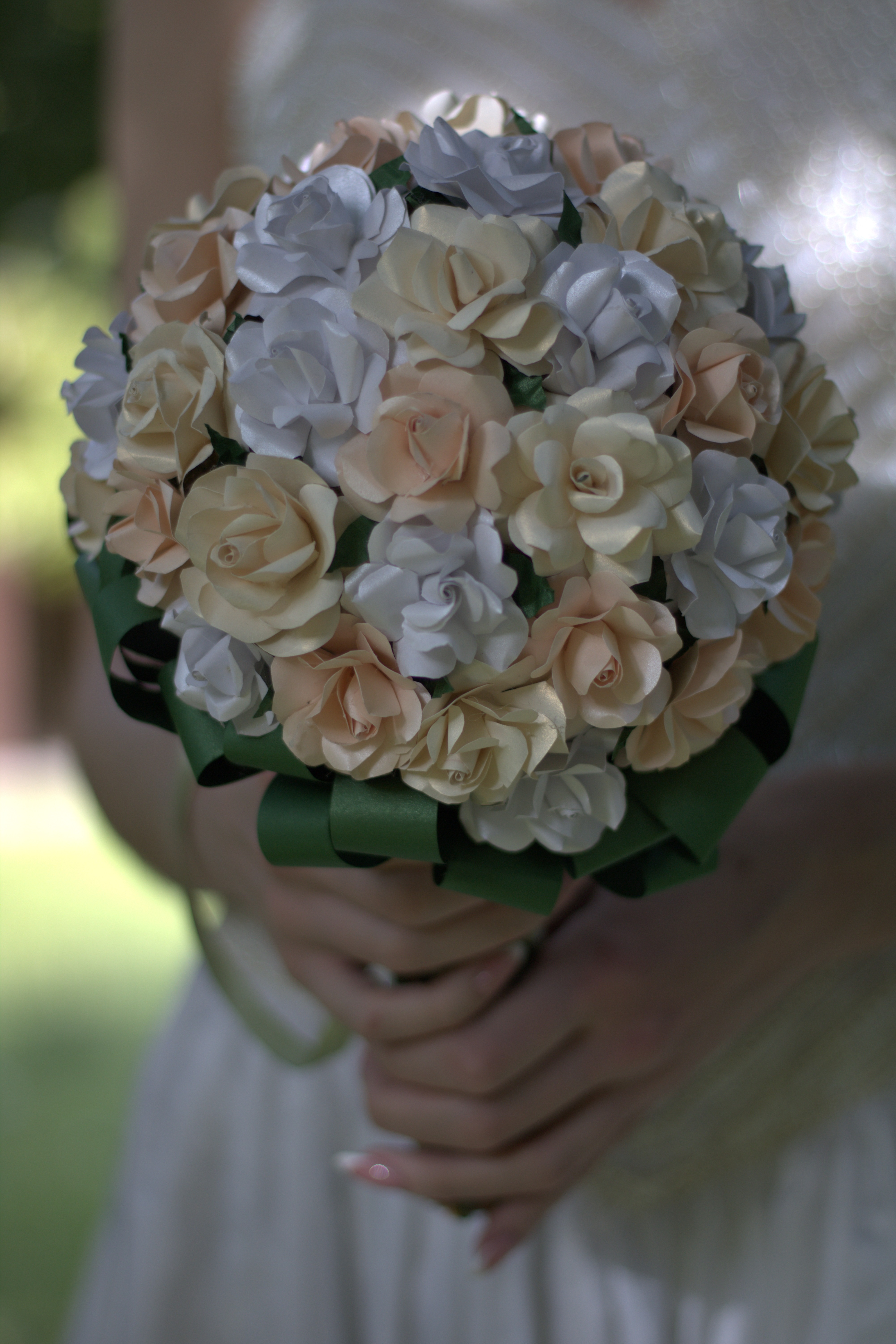 Ez a csokor 45 darab kis tearózsából készült, az alapja egy hungarocellgömb. A virágok és a zöld sáslevelek fényes Rössler papírból készültek. A csokor szára természetes virágszárakból áll, amelyet selyemszalaggal ás minirózsás díszgombostűvel díszítettem. A száron lévő szalagba bebújtatva a kezedet nem kell attól tartanod, hogy a csokrot véletlenül elejted. A virágfej átmérője 18 cm, a csokor teljes hossza 32 cm, a szár ebből 14 cm. A csokor súlya 180 gramm. Ez egy közepes csokornak számít, irányára 50 000 Ft. Elkészítési ideje minimum 3 hét.