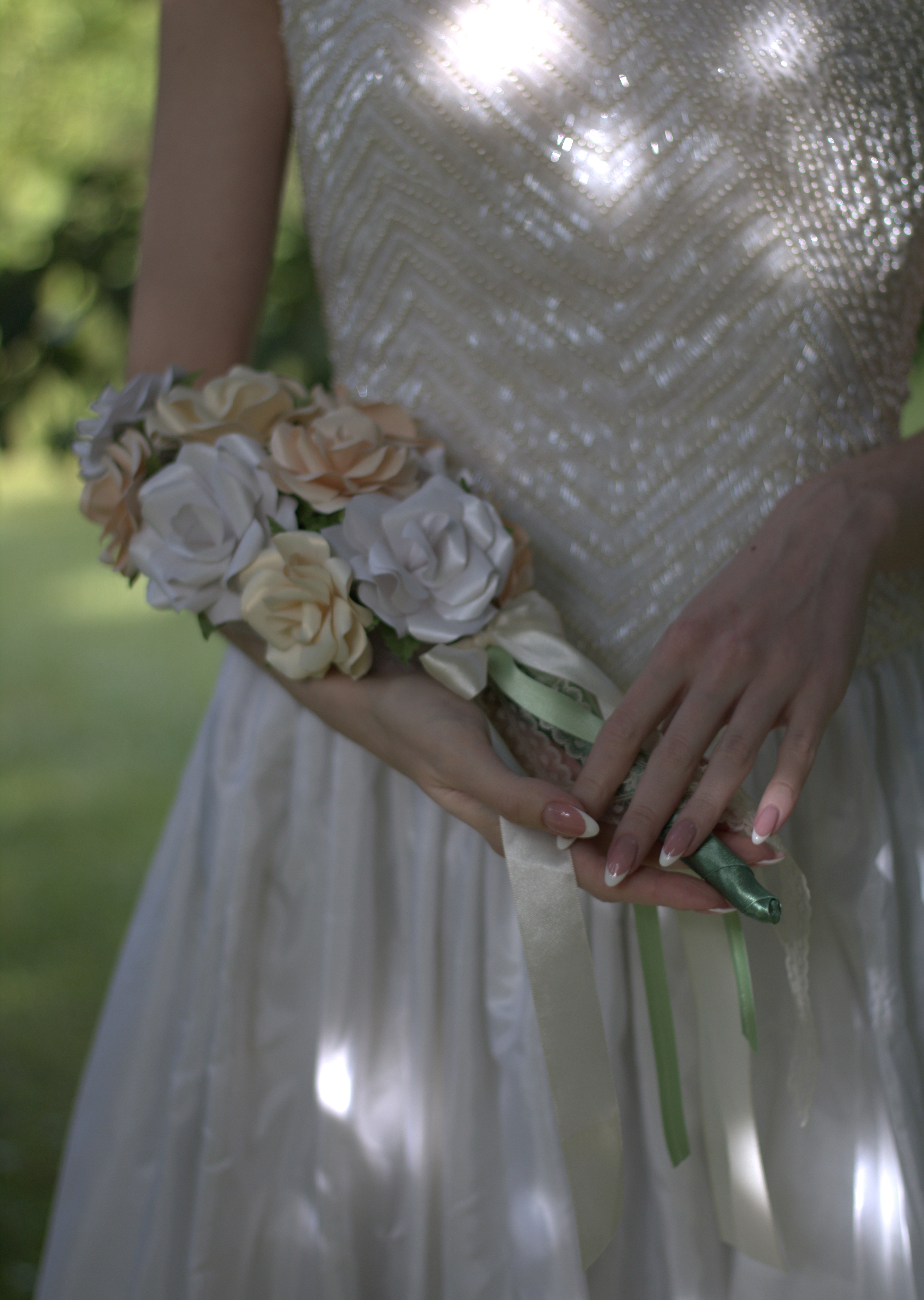 11 darab külőnböző méretű és színű rózsából készített csokor, szalagokkal díszítve. A rózsák metálfényű Rössler papírból készültek, A szár zöld selyemszalaggal bevont természetes hibiszkusz-szár. A csokor rendkívül könnyű, szinte nincs is súlya. A csokor teljes hossza kb. 45 cm, a szár hossza 18 cm. Ez egy közepes méretű csokor. Nézd meg szettben is!